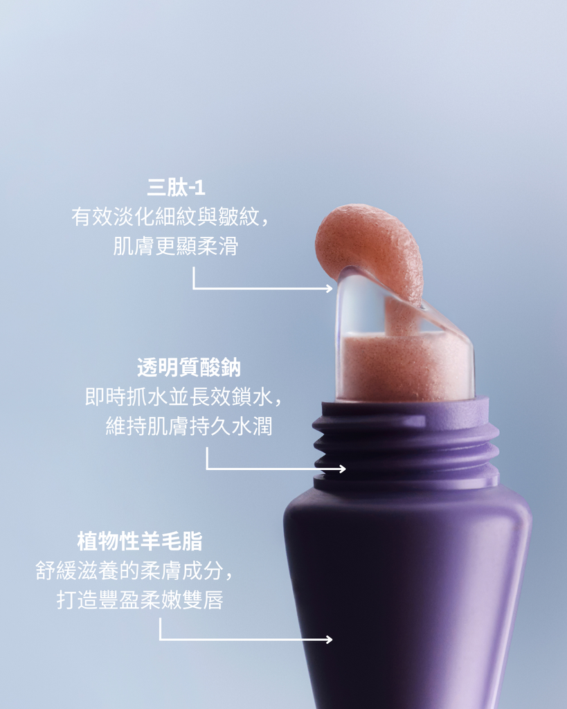 - 植物性羊毛脂:具有舒緩與滋養功效,植物性羊毛脂能發揮潤膚作用,鎖住水分,讓雙唇豐盈柔嫩。