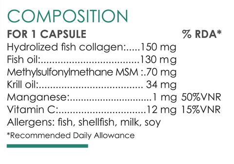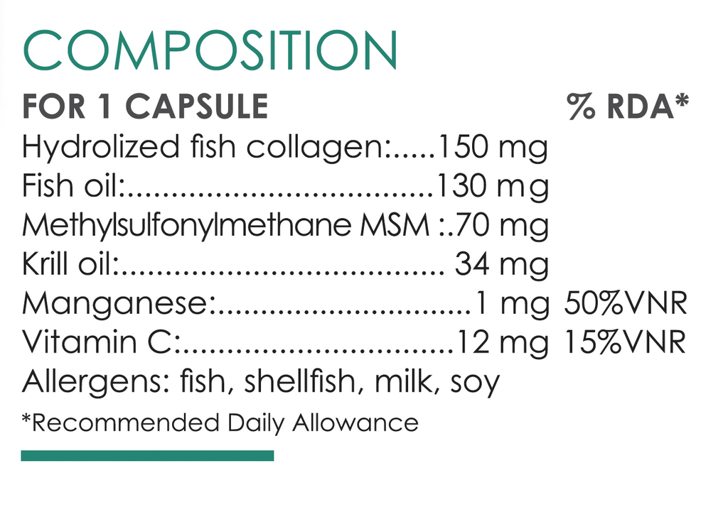 完整成分:水解魚膠原蛋白、魚油、葡萄糖漿、植物油、甘露醇、酪蛋白酸鹽、大豆蛋白、抗壞血酸鈉、二磷酸四鈉、卵磷脂、磷酸三鈣、調味劑、生育醇(維他命E)、植物膠囊(羥丙基甲基纖維素)、甲基磺酰甲烷(MSM)、磷蝦油粉末、脂肪酸鎂鹽、維生素C、葡萄糖酸錳。